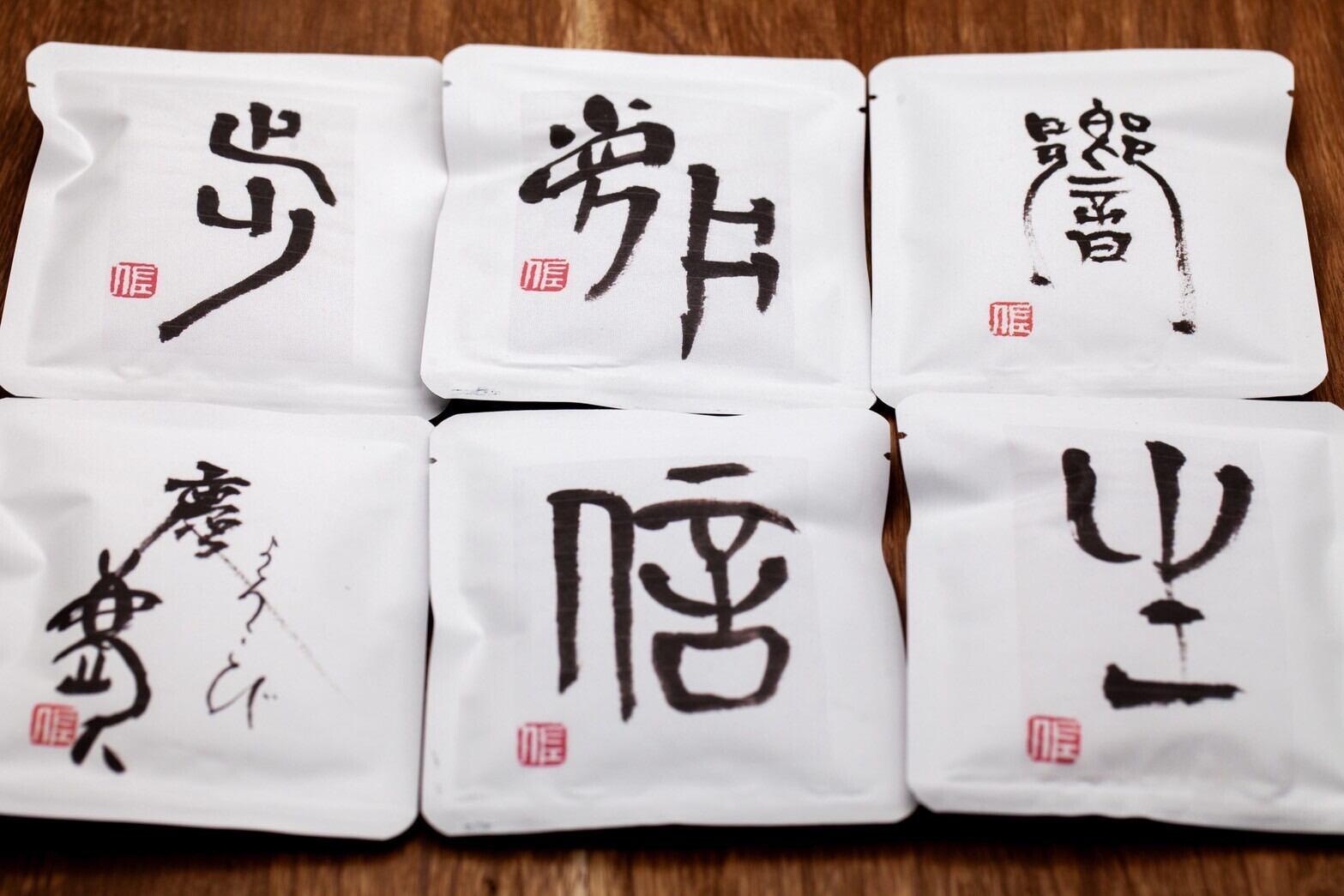 一筆コーヒーは、毎月一つの言葉を筆文字で表現したラベルとともに、選りすぐりの豆をお届けする定期便です。